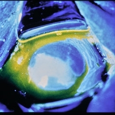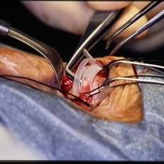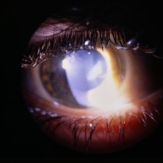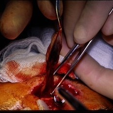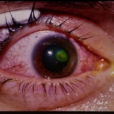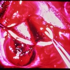 Surgical view- exposing globe to repair traumatic rupture. Limited view blocked by surgeon hands.