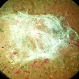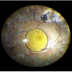 Color fundus photography of right eye of a 54-year-old man, with history of blunt trauma seven month ago. VA HM. IOP 18mmHg. There is no peripherical lesions or traction.