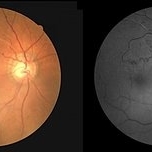 64-year-old man, VA CF AO. Inactive neovascularization. Color fundus and red free photograph.