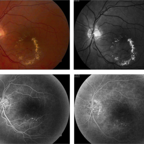 77-year-old man. Decrease of visual acuity OS. VA 20/30 IOP 14mmHg. Fundus examination findings: Hard exudates, microaneurysms near to fovea. OCT shows IRF. Late leakage on FA.