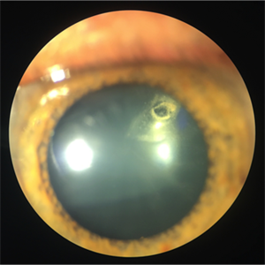 Anterior segment photograph of a 24-year-old female with crystalline lens displacement, showing zonula fibers opposite to the direction of the lens.