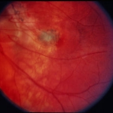 Condition/keywords: choroidal neovascular membrane (CNVM), color photo, linear nevus sebaceous syndrome