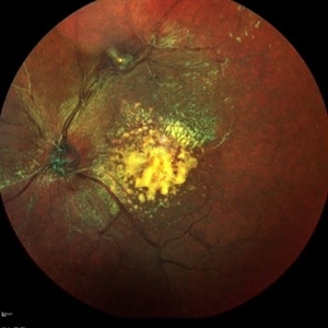 Fundus photograph of right eye of a 12-year-old girl with Central retinal vein occlusion with cilioretinal artery occlusion secondary to haemoglobinopathy