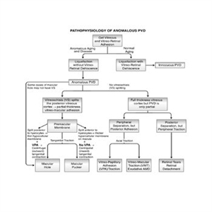 This unifying concept of vitreo-retinopathies hypothesizes that the pathogenesis of several vitreoretinal diseases that were previously considered very disparate, are actually all manifestations of the same underlying pathophysiology – anomalous PVD. Note that vitreo-papillary adhesion (VPA) and traction can cause primary optic neuropathy, but might also play a role in facilitating/promoting cell migration and proliferation during pathologic neovascularization of the optic disc. Further, VPA seems to alter the vector of tangential forces exerted by a membrane, in some cases full-thickness posterior vitreous cortex and in some cases the outer layer of the posterior vitreous cortex left attached to the macula after vitreoschisis. While not all cases of macular holes have vitreoschisis, they feature vitreomacular adhesion and traction almost always with VPA. [From Sebag J: Anomalous PVD – a unifying concept in vitreo-retinal diseases. Graefe’s Arch Clin Exp Ophthalmol 2004;242:690-8 and Sebag J, Niemeyer M, Koss M: Anomalous PVD and vitreoschisis. In: Vitreous – in Health & Disease (J. Sebag, ed.) Springer, New York, 2014, pg. 252; image © Springer Nature, reprinted with permission]