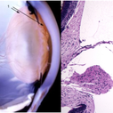 The hyaloid artery (“3”, left) feeds the vasa hyaloidea propria (“2”, left) which anastomosis with the tunica vasculosa lentis (“1”, left). The histologic section to the right is stained with H & E (bar = 100 uM) [Left: from Yee at al.: Vitreous cytokines and regression of the fetal hyaloid vasculature. In: Vitreous – in Health & Disease. Springer, New York, 2014; pg. 42 (image © Springer Nature, reprinted with permission) Right: from Sebag J: Vitreous and vitreo-retinal interface. In: Ryan’s Retina 6th edition (A. Schachat, ed.) Elsevier, 2018; pg. 546.