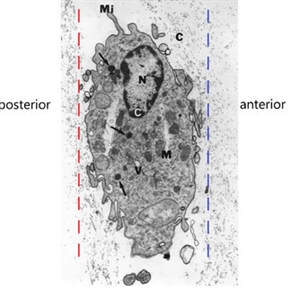 Transmission electron microscopy of human hyalocyte in situ demonstrates embedding within the dense collagen matrix of the posterior vitreous cortex. The retina was to the left (“posterior”) and the anterior segment was to the right (“anterior”). The red dashed line indicates the level of vitreoschisis split that might occur posterior to the level of the hyalocyte monolayer, leaving a thin, hypocellular membrane attached to the macula. The dashed blue line indicates the level of vitreoschisis split that might occur anterior to the level of the hyalocyte monolayer, leaving a thick, hypercellular membrane attached to the macula. The former is more likely to present as macular hole, while the latter as macular pucker (see Figure 12). Mi = microvilli; black C = collagen of posterior vitreous cortex; N = lobulated nucleus typical of mononuclear phagocytes; white C = dense marginal chromatin in nucleus; M = mitochondria; V = vacuoles; arrows = dense granule (original magnification = 11,670) [Modified from Sebag J: Anomalous PVD – a unifying concept in vitreo-retinal diseases. Graefe’s Arch Clin Exp Ophthalmol 2004;242:690-8 and Sebag J, Niemeyer M, Koss M: Anomalous PVD and vitreoschisis. In: Vitreous – in Health & Disease (J. Sebag, ed.) Springer, New York, 2014, pg. 252]
