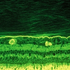 Immunohistochemistry of a monkey eye imaged with fluorescein conjugated ABA lectin staining demonstrates the lamellar structure pf the posterior vitreous cortex. During anomalous PVD, there can be splitting between these lamellae, a phenomenon known as vitreoschisis. (original magnification = 400x)