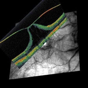 Combined OCT and Scanning laser ophthalmoscopy demonstrate separation of full-thickness posterior vitreous cortex (no vitreoschisis), but persistent adhesion centrally with significant detachment of the fovea. [from Sebag J: Vitreous – in Health & Disease (J. Sebag, ed.) Springer, New York, 2014; image © Springer Nature, reprinted with permission]