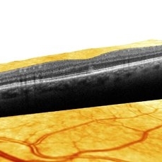 Infrared and HD-OCT of the right eye in a 55-year-old African American female with high myopia (more than -6.00 D), BCVA: 20/25 OU Cartwheel appearance of the fovea in the infrared imaging is visible. HD- OCT demonstartes schisis in different layers of the retina (both NFL and OPL; notice stretching of the Muller cells); VMT is also present . Outer retinal layers are preserved which explains the good vision . She had the same findings in OS.