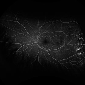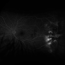 #4 Recirculation phase fluorescein angiography of the same patient demonstrating increased hyperfluorescence and leakage from abnormal vascular lesions in temporal periphery. Note the capillary non perfusion area anteriorly.