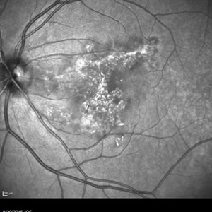 Red free photograph of an 18-year-old with macular serpiginous choroidopathy.