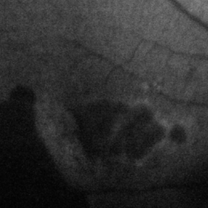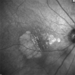 Infrared image: Note the scrolled and redundant RPE just temporal to the fovea and the absent RPE more temporally where there are visible larger choroidal vessels.