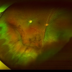 Suprachoroidal Hemorrhage Suprachoroidal HemorrhageSep 2 2020 by Rinal Pandit Fundus photograph of left eye of a 56-year-old female with primary angle closure glaucoma showing massive hemorrhagic choroidal detachment that developed following trabeculectomy surgery. Suprachoroidal hemorrhage is defined as the accumulation of blood within the potential space between the choroid and sclera, with the source of the blood being the long or short posterior ciliary artery. Delayed suprachoroidal hemorrhage (DSHC) remains one of the most dreaded and sight threatening complications of glaucoma filtration surgery. The risk factors include old age, hypertension, high myopia, arteriosclerosis, chronically elevated IOP, sudden hypotony, trauma, aphakia/pseudophakia, prior vitrectomy, history of 5 FU injections and anti-platelet agents. The incidence of postoperative SCH after trabeculectomy varies between 0.6%- 1.4%. DSCH after surgery varies considerably in severity but is generally characterized by the sudden onset of severe pain, decreased vision, and a shallow anterior chamber usually associated with raised intraocular pressure. B-scan ultrasonography can help to distinguish serous from hemorrhagic choroidals.Suprachoroidal hemorrhages appear as dome-shaped elevations of the retina with increased echo densities that are often heterogeneous and within the suprachoroidal space. Choroidal effusions appear as dome-shaped elevations with hypoechoic suprachoroidal space. The first step in the management is the timely diagnosis. Medical management includes oral and topical antiglaucoma drugs to lower IOP, oral and topical steroids to control inflammation and topical cycloplegics and oral analgesics to tackle pain. Serial ultrasound B scans of the affected eye should be performed in order to monitor progression of the SCH and help determine apposition, height, and liquefaction of the SCH. Indications of surgical drainage include non resolution with medical management,concurrent retinal detachment, central retinal apposition (kissing choroidals) and incarceration of vitreous in the wound site. The ideal time of drainage is between 7-14 days depending upon clot lysis. The prognosis of both intraoperative and postoperative SCH is poor. An overwhelming majority of patients do not achieve pre-hemorrhage visual acuity and most do not recover to a visual acuity of 20/200 or better. The major determinants of good or bad visual outcomes of SCH’s are preoperative visual acuity and retinal detachment at the time of hemorrhage, respectively. Imaging device: OPTOS,Ultra wide field retinal imaging system Condition/keywords: suprachoroidal hemorrhage, trabeculectomy, ultra-wide field imaging