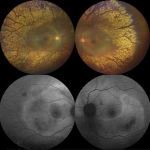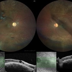 Fundus Photograph of a 25-year-old male with juvenile x-linked retinoschisis with inner retinal defects seen above superior and inferior arcades in both eyes. Corresponding OCT showing retinal schisis involving fovea.