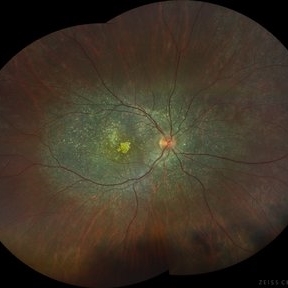 Fundus photo of the left eye of a 21-year-old gentleman with complaints of reduced vision, nyctalopia and visual field reduction. Fundus photograph showing numerous small glistening yellow-white retinal crystalline deposits in the retina.
