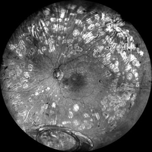 Fundus photo of the right eye of a 21-year-old gentleman with complaints of reduced vision, nyctalopia and visual field reduction. Fundus photograph showing numerous small glistening yellow-white retinal crystalline deposits in the retina.