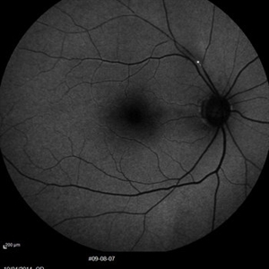 Auto fluorescence fundus image of a 70-year-old man with a superior temporal branch retinal artery occlusion. The emboli can be very clearly seen as the white dot of AF blockage.