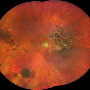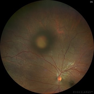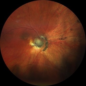Fundus photograph of an 18-year-old -5.50 D myope patient presenting with loss of vision in the right eye