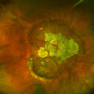 Fundus photo of an 85-year-old woman with degenerative myopia and a large posterior staphyloma