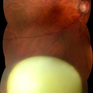 Male patient, 23-years-old, with low visual acuity in the right eye. In the ocular examination of the retinography, intense subhyaloidal hemorrhage. 2 minutes after laser application.