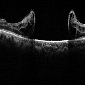 A 14-year-old male patient was admitted for visual evaluation. Visual acuity s/c in the right eye and 20/80 in the left eye. According to family members, he reported low vision since childhood. He had already undergone treatment with photocoagulation in another service to which he had a diagnostic hypothesis of Coatas disease. Laboratory tests were requested (HIV, TOXO, TOXOCARIASIS, ECA, VDRL, PPD). In the evaluation it was observed important exudation in the posterior pole, some vascular irregularities in the right eye. In the left eye, there is retinoschisis affecting the entire posterior pole and the region nasal to the optic disc, macula with a characteristic aspect of a cartwheel. Well exemplified by OCT-A (Structrure Deep: IPL - 25, OPL - 25).