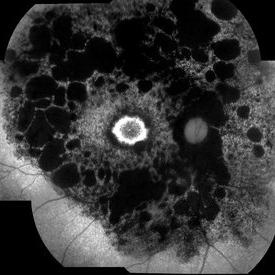 Patient 52 years old, Male, progressive loss of vision since the age of 20. Retinography showed mobilization of pigments in osteoblasts, extensive area of atrophy of the pigmentary epithelium and choroid. On fluorescein angiography, typical changes following the characteristic patterns of paracentra retinal retinitis pigmentosa. Autofluorescent fundus with a sectorial autohypofluorescence pattern in the regions of atrophies.