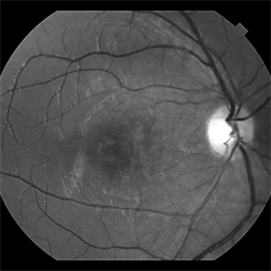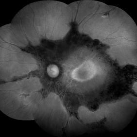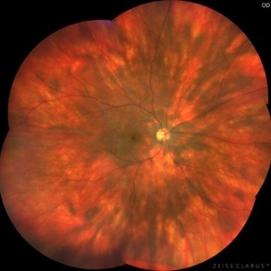 Female patient, 28-year-old, with low vision in both eyes since childhood. In routine examination, important changes were observed with atrophic, symmetrical and bilateral aspects with apparently preservation of the central retina.