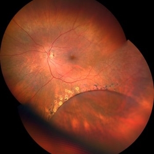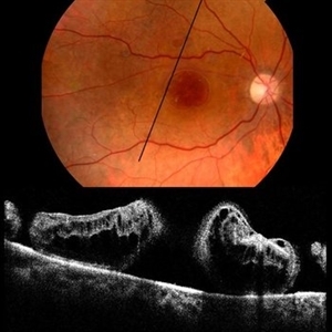 Patient 55 years old, Female, progressive loss of vision. In funduscopic evaluation and photographic documentation, the presence of retinoschisis in the inferior temporal region surrounded with laser photocoagulation was observed.