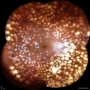 54-year-old female patient, visual acuity 20/100 both eyes. In the evaluation, she presented choroidal atrophy, starting from the optic nerve towards the periphery of the retina. Serpiginous retinal degeneration