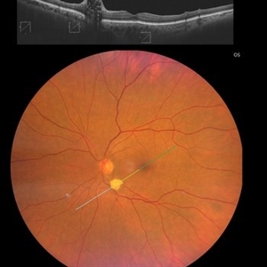 In this image composition, two different photo planes were used, one with a normal sequence plane with focus on the retina and the other used the parameters of anterior tracking photography of the retinograph lens "A" with a compensation of 3 diopters to bring forward the focus of the image to Ozurdex stick. In order to fully visualize the medication, it is necessary to ask the patient to move his eyes up and down.