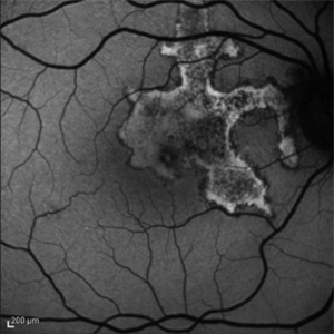 Autofluorescence imaging of an 48-year-old man with decreased visual acuity in the right eye for 15 days. In time, undergoing tuberculosis treatment.