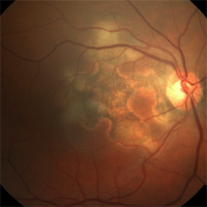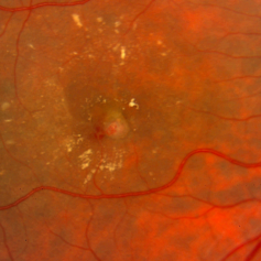 Fundus photograph of an 56-year-old man with a retinal angiomatous proliferation (RAP). RAP has been known as a variant of exudative age-related macular degeneration (AMD) with a unfavorable prognosis.