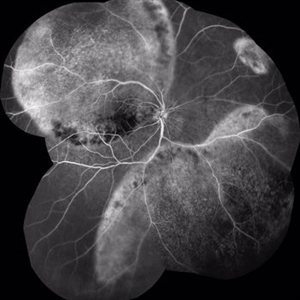 28-year-old white man was referred to the rheumatology clinic with gradually and rapid deterioration of the vision (both eyes). In this picture, we can observe vasculitis (leakage from vessels) and diffuse ischemia in the left eye.