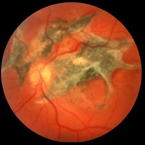 Traumatic chorioretinal scarring, with less hemorrhage, 1 month later.