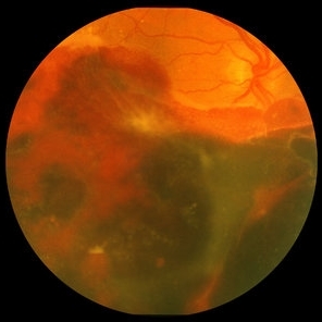 PDR with severe subhyaloid hemorrhage, pre-op.