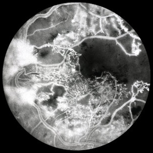 PDR with foveal ischemia, and FAZ enlargement, multiple microaneurysms, FA, early phase.