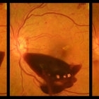 Fundus photograph series of a 55-year-old man with left eye preretinal hemorrhage involving the visual axis, resolved with NdYAG laser. Photographs taken before, 1 hour after and 1 month after the laser.