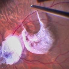 Intraoperative photo of triamcinolone stained hyaloid being being lifted with vacuum generated by the cutter to detach it.