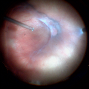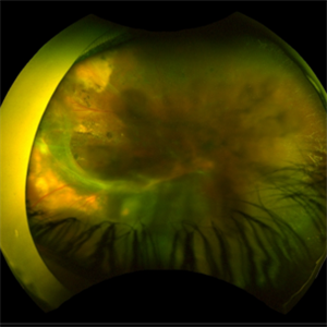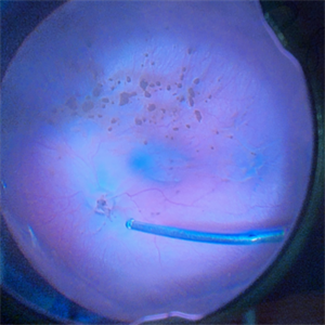 This is a intraoperatory picture taken during a vitrectomy due to dense vitreous hemorrhage