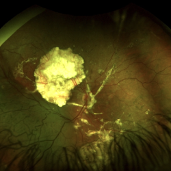 8-year-old boy with a retinal fold secondary to peripheral toxocara canis granuloma localized on the superior retina.