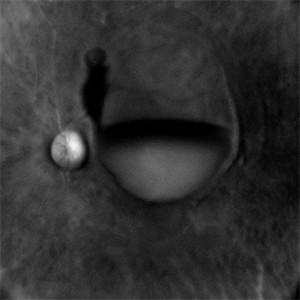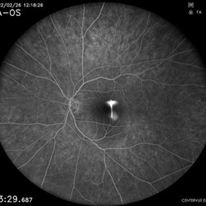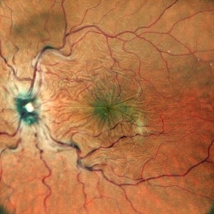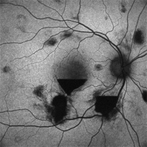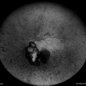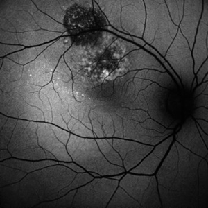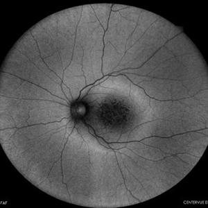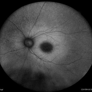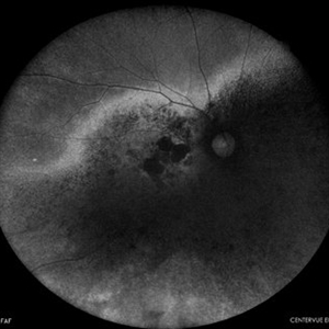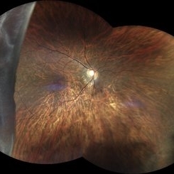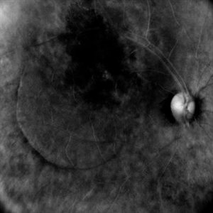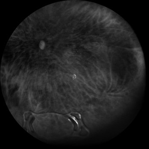Fundus infra-red image of a 47-year-old male with IOL in vitreous cavity right eye.