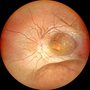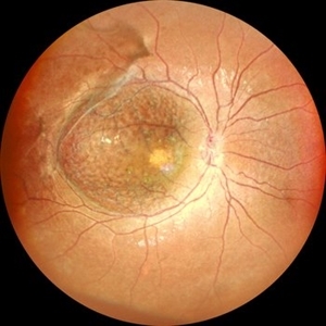 Fundus photograph of a 5-year-old male child who presented with unilateral diminution of vision since one month.