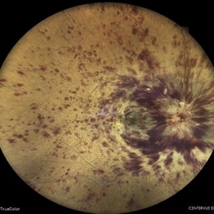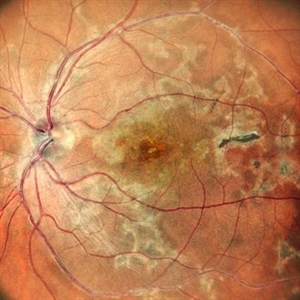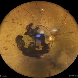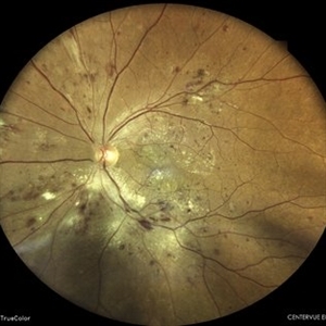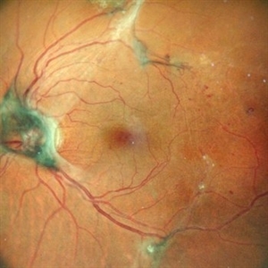 COLOUR FUNDUS PHOTO OF A 71 YEAR OLD MALE WITH SCARRING POST PAN-RETINAL PHOTOCOAGULATION
