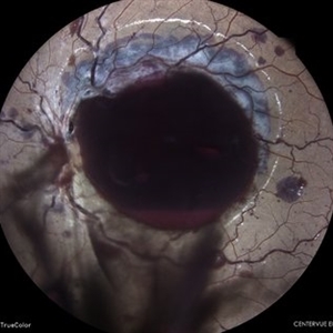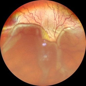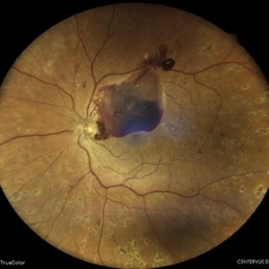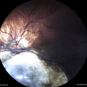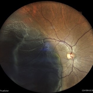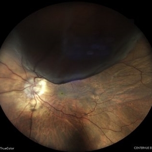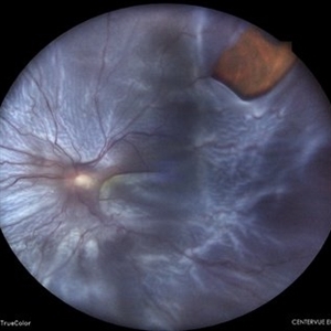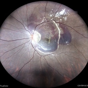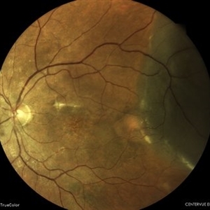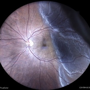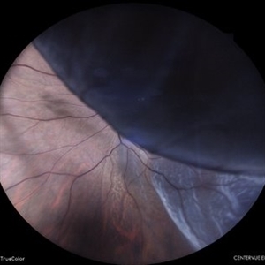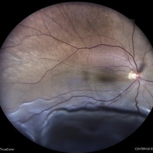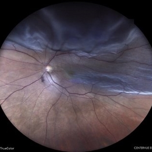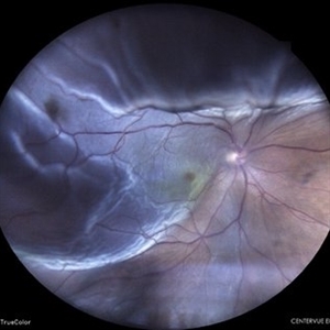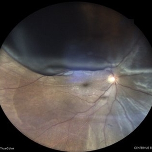 Color fundus photograph of a 65 year old male with retinal detachment with horse shoe tear at 12 o'clock.