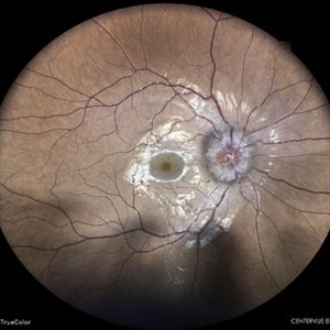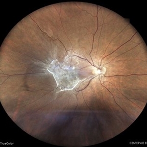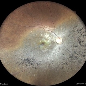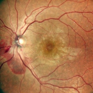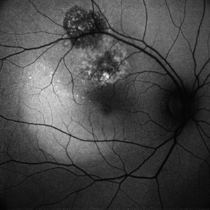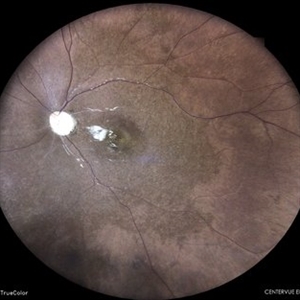 FUNDUS PHOTOGRAPH OF AN 18 YEAR OLD MALE WITH A SCARRED CHOROIDAL NEOVASCULAR MEMBRANE