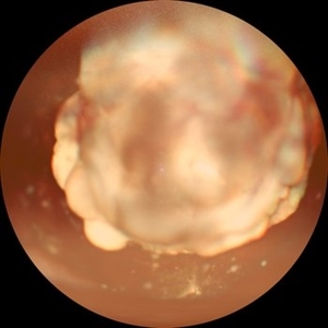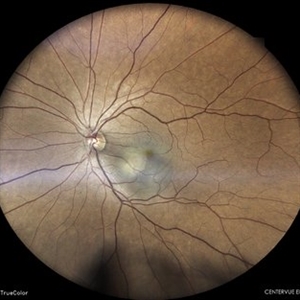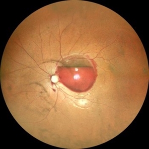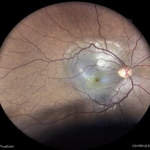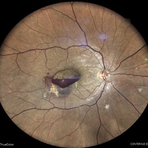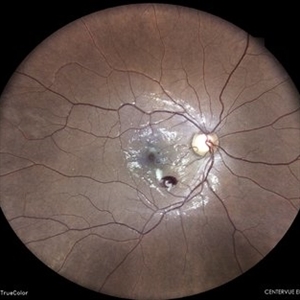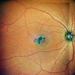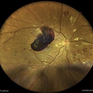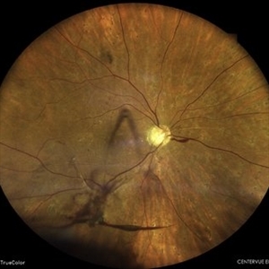 Wide field fundus photograph of a 36 year-old male with a macular pre-retinal hemorrhage.