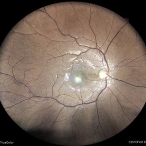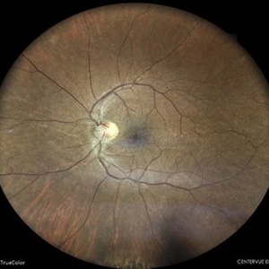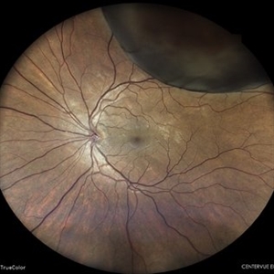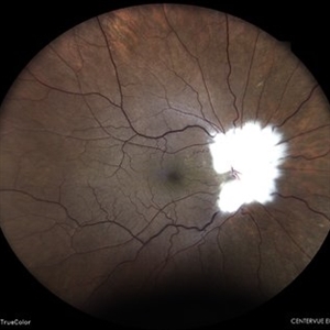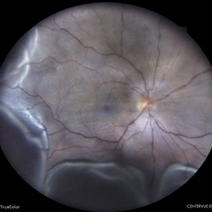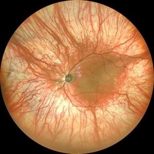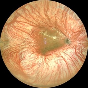 Infra-red capture of 5-year-old male with familial exudative vitro-retinopathy with disc pallor.