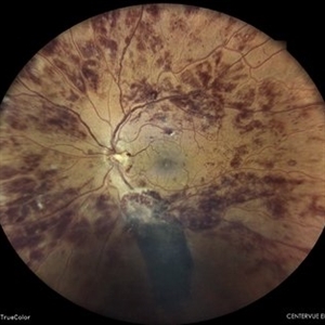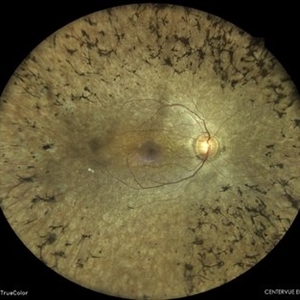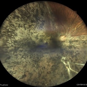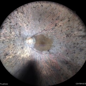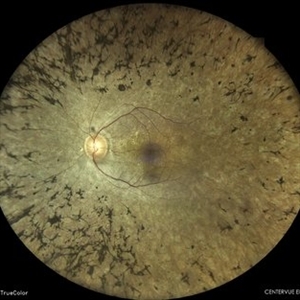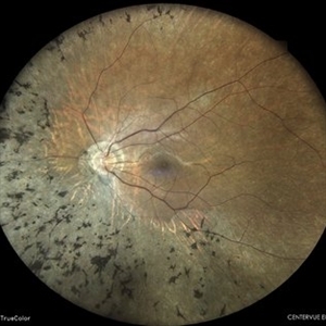 Color fundus photograph of a 59 year old male with retinitis pigmentosa with retinal thinning.