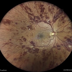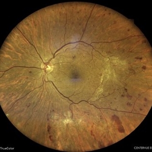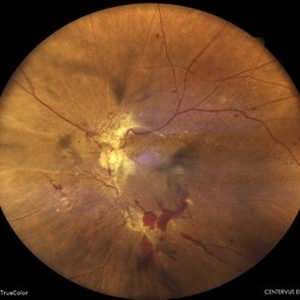 Color fundus photograph of a 64 year old hypertensive male with ischaemic central retinal vein occlusion.