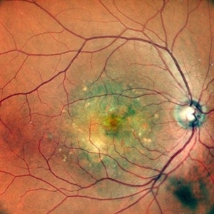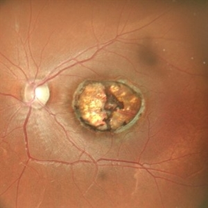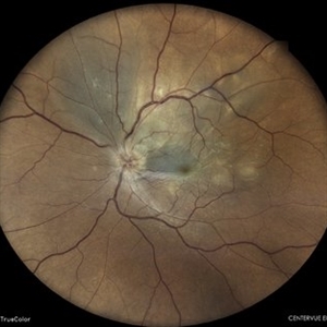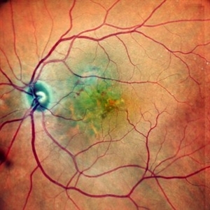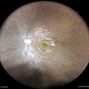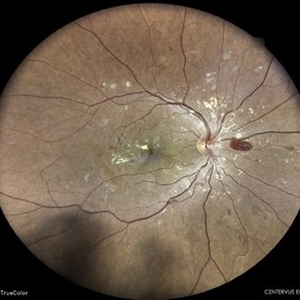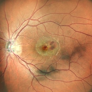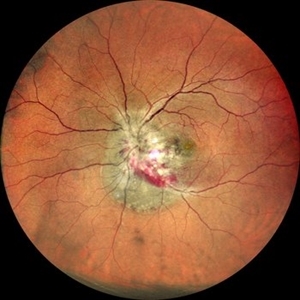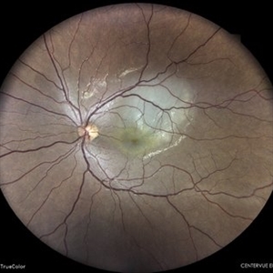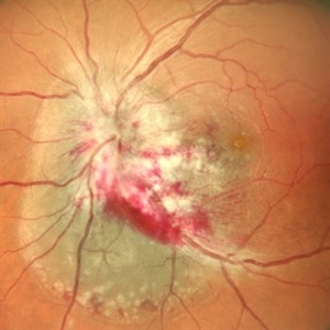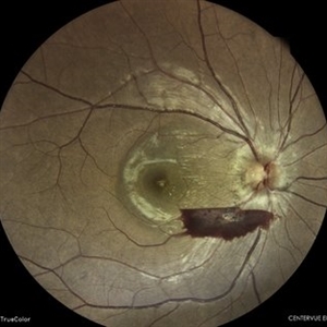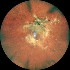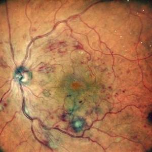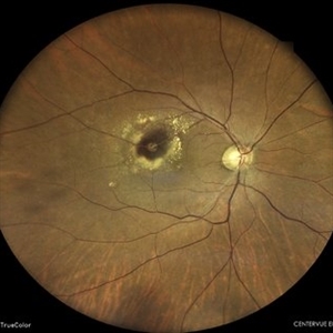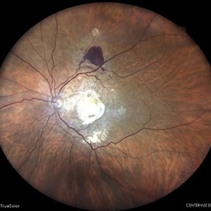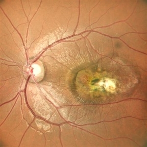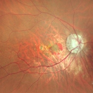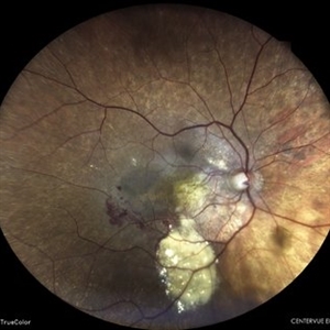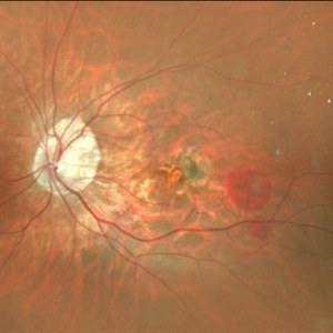 COLUR FUNDUS PHOTOGRAPH OF A 28 YEAR OLD MALE WITH SUB RETINAL NEOVASCULAR MEMBRANE